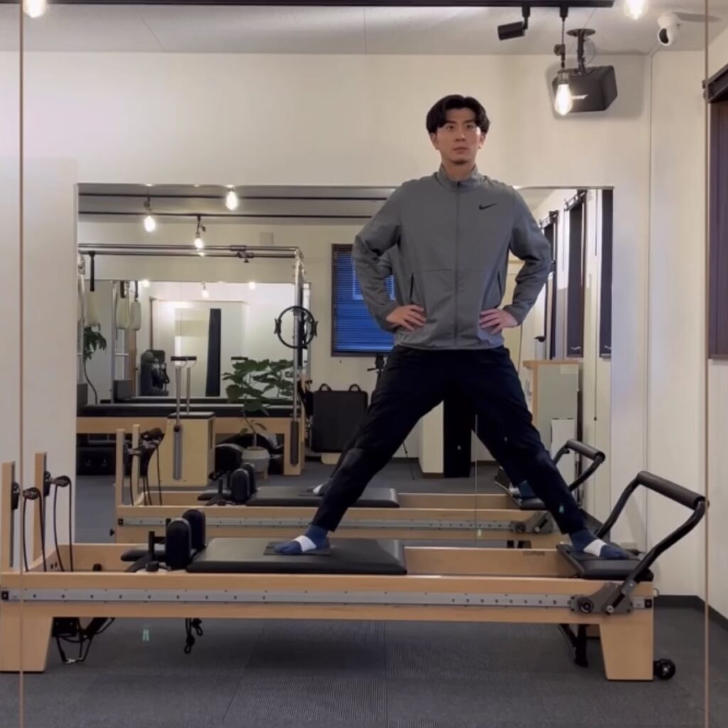 リフォーマーの上に乗って、脚を左右に開いていくエクササイズです。