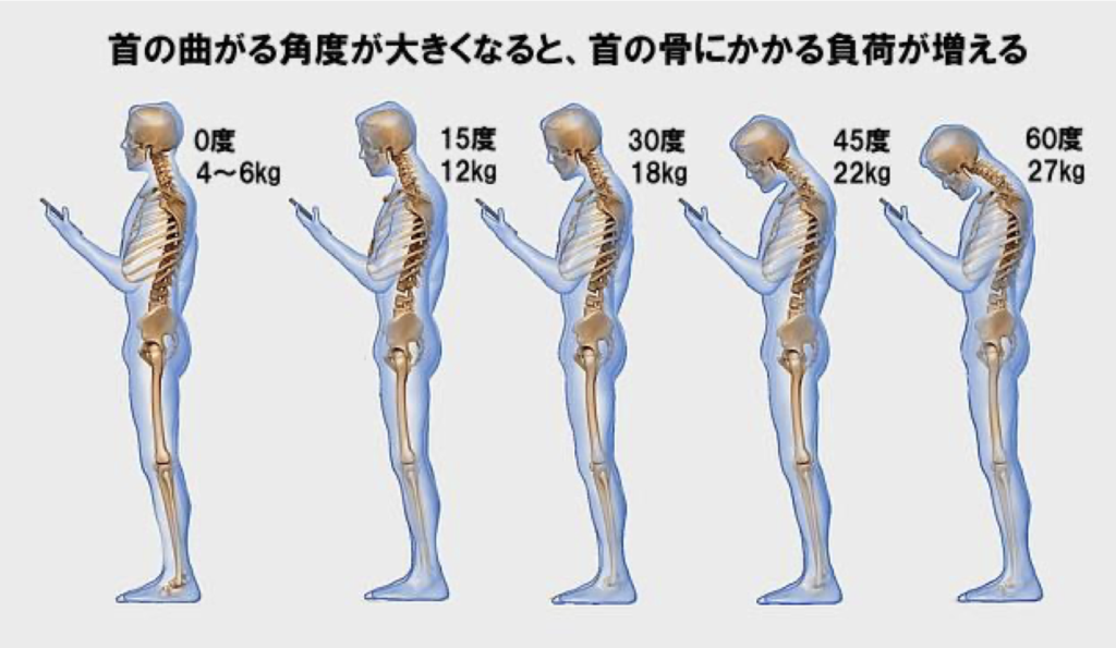 首の角度が30度前傾するだけで、首への負担は約18kgにまで増えるというデータもあります。